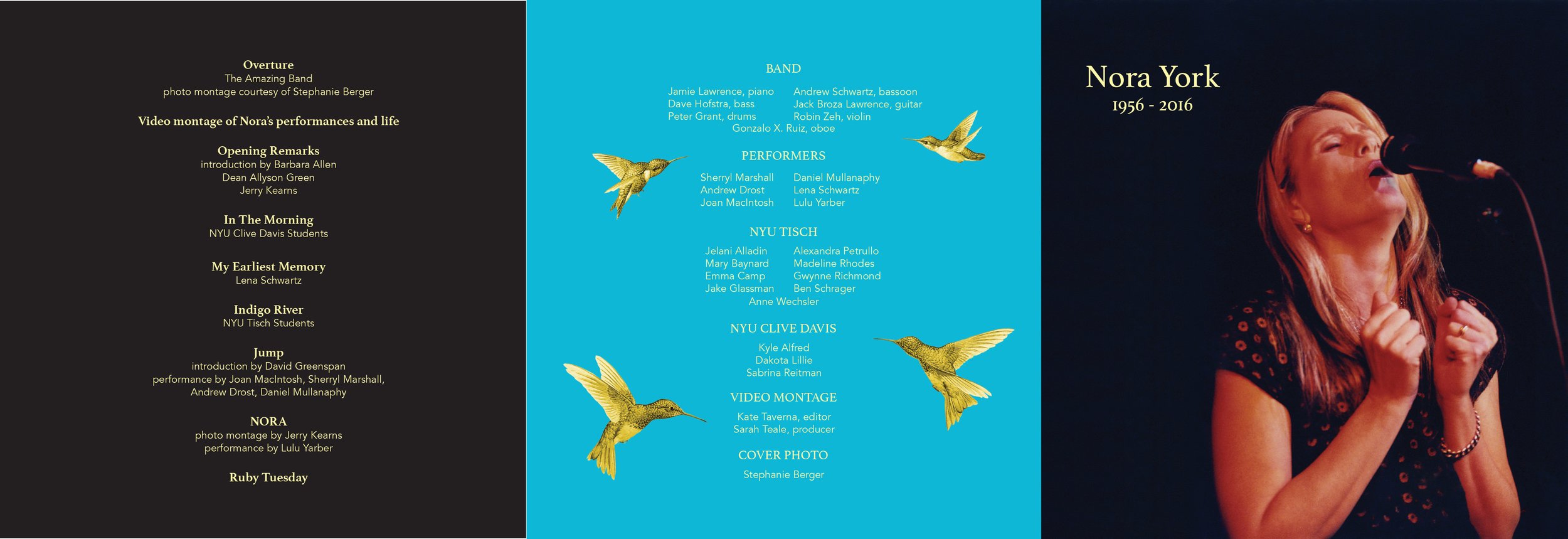 Design for a trifold program for the 2017 memorial celebration of the life of Nora York.
