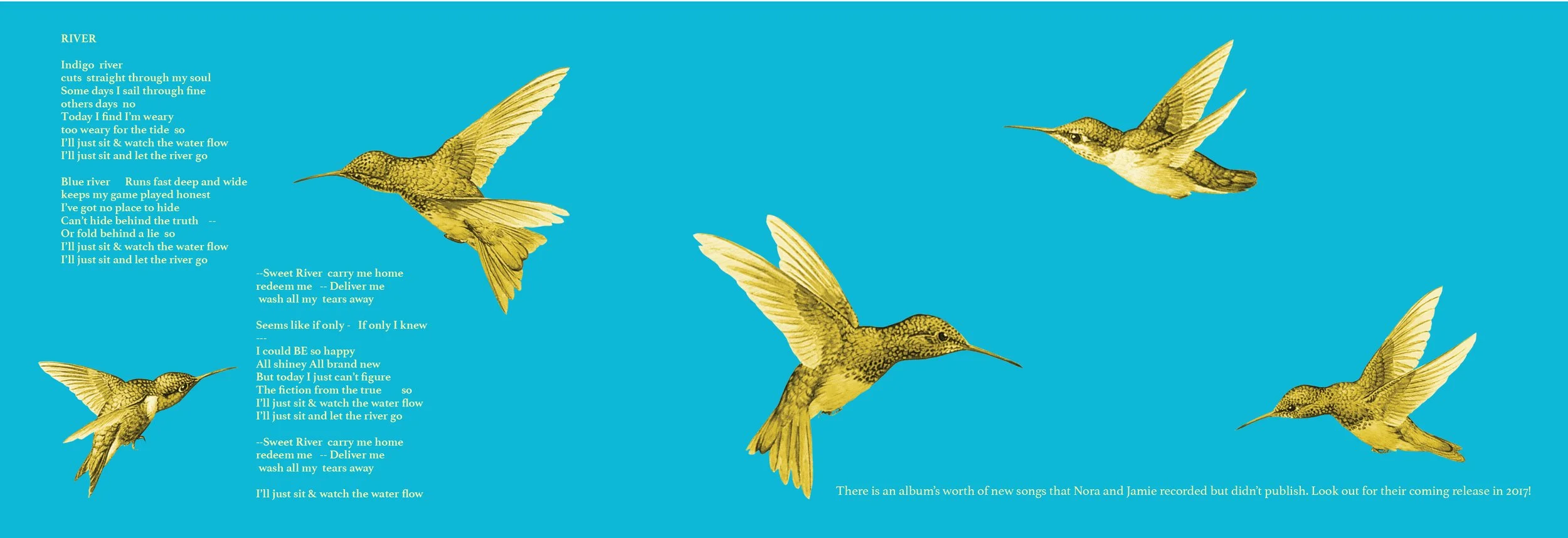 Due to the nature of the project, the client gave me very little guidance on the design of this project outside of the information that it needed to include. I suggested formatting it so that the CD (below) that he wished to give to the attendees could be folded into the design. The blue color is a blue that York used on a previous album that referenced the same blue that her artist husband, Jerry Kearns, uses in many of his paintings. The hummingbirds are also elements from Kearns’ art that he has long used to symbolize Nora.